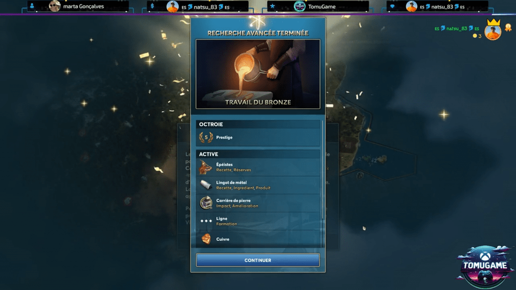 Concernant mon premier choix de technologie, j’ai opté pour la fabrication de cordes pour de futurs filets de pêche. L’arbre technologique est plutôt complet et lié à différentes époques. Un descriptif complet apparaît pour la technologie choisie, montrant ce qu’elle va débloquer. Par exemple, pour moi, cela a débloqué de nouvelles recettes, produits, filets de pêche, améliorations, Stonehenge, culture, camp de bûcheron, ressources, et poissons. Dans l’exemple ci-dessous, j’ai terminé le travail du Bronze.