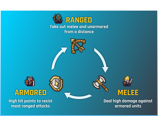 Mêlée, Blindé, À distance, Assassin, Soutien