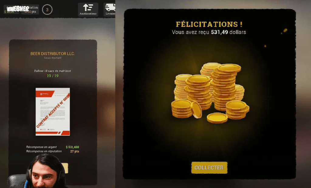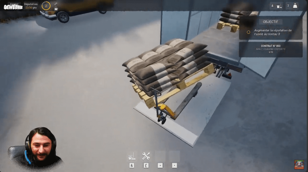 Dès mes premiers pas dans Beer Factory, j’ai été confronté à des bugs de placement d’objets et d’affichage qui, bien que perturbants, n’ont pas entaché l’expérience globale. Des contrats promettant des récompenses substantielles ne livrent pas toujours ce qui est annoncé, avec des erreurs notables, comme un contrat de 500 000$ se traduisant par seulement 500$. Le camion de livraison, pressé de partir, a également montré des signes de précipitation en buguant devant l’entrepôt. De plus, le transpalette manuel s’est révélé parfois capricieux, se bloquant fréquemment lors de déplacements.