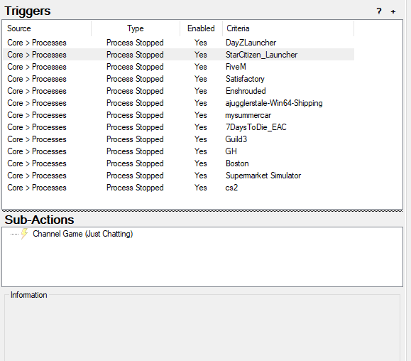 Dans un monde parfait, quand on lance un jeu en stream, on aimerait que la catégorie se modifie toute seule. Dans cette solution, il faudra lister chaque process pour que lorsqu’il sera lancé, le “triggers” que vous avez placé change la catégorie.