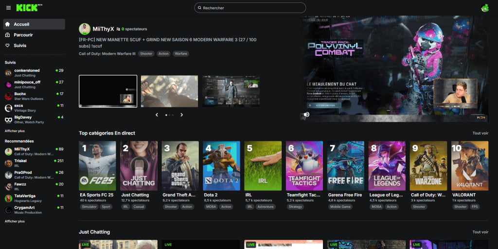 - Une interface plus moderne et intuitive : Kick a revu l’ensemble de sa charte graphique, offrant un design plus épuré et une navigation simplifiée.