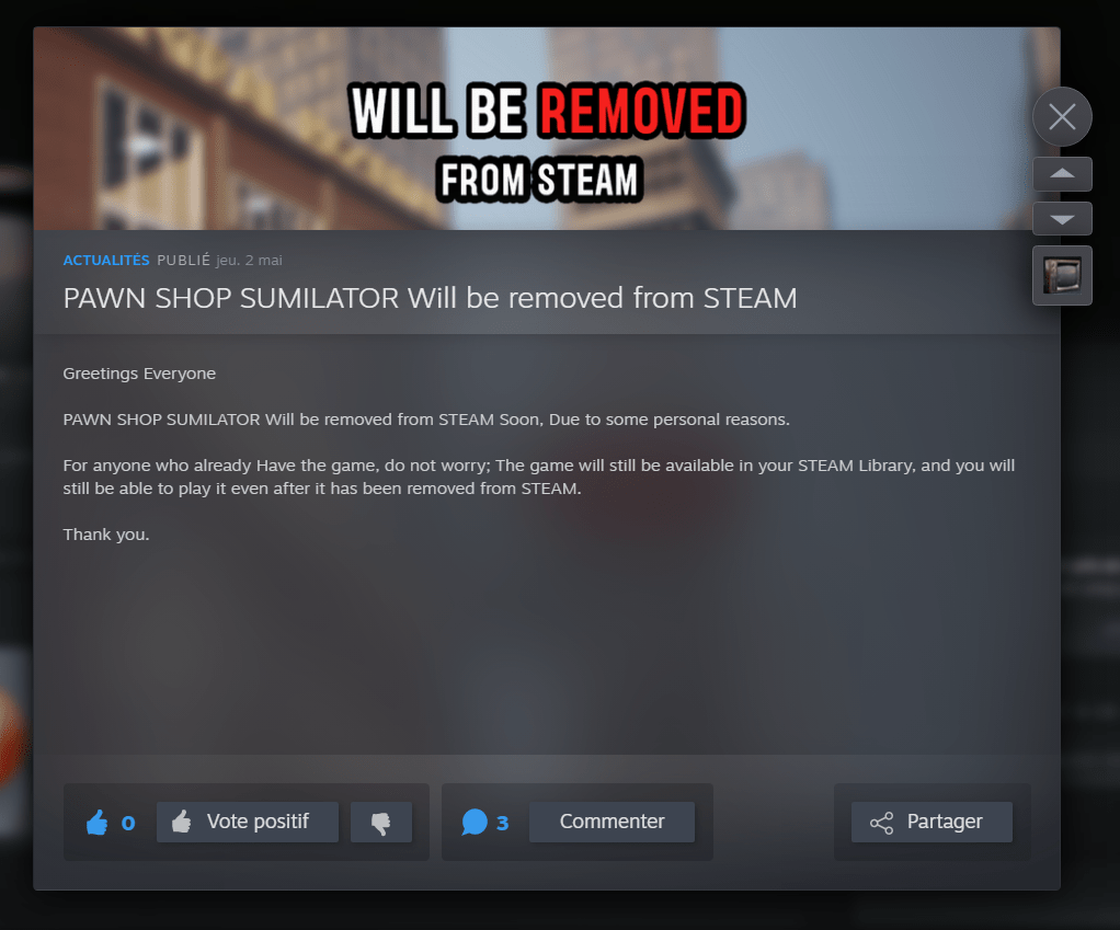Pawn Shop Simulator: Après avoir exploré Pawn Shop Simulator, je peux dire que c'est un jeu qui suscite des réactions contrastées. D'un côté, j'ai le jeu peu amusant si ce n'est acheter et vendre. Cela a été très décevant, car je n'ai même pas pu expérimenter un gameplay intéréssant. D'un autre côté, une fois que j'ai pu jouer, j'ai trouvé que le jeu manquait de diversité. Il y a beaucoup plus de clients venant vendre leurs articles que de clients prêts à acheter, ce qui rend l'attente pour effectuer des transactions assez longue et ennuyeuse. De plus, les profits réalisés à chaque vente sont minimes par rapport aux coûts élevés des améliorations de la boutique. Cela rend la progression dans le jeu laborieuse et peu gratifiante. Cependant, malgré ces défauts, j'ai apprécié l'aspect progressif du jeu. Le fait de ne pas fixer les prix des articles peut sembler limitant au début, mais les objectifs du jeu offrent des récompenses incitatives qui rendent l'expérience plus intéressante. Dans l'ensemble, "Pawn Shop Simulator" offre une expérience de simulation de magasinage unique, mais avec quelques défauts qui pourraient en frustrer certains. – DeWebNer