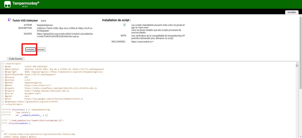 Une fois fait, vous installer le script dans votre plugin Tampermonkey