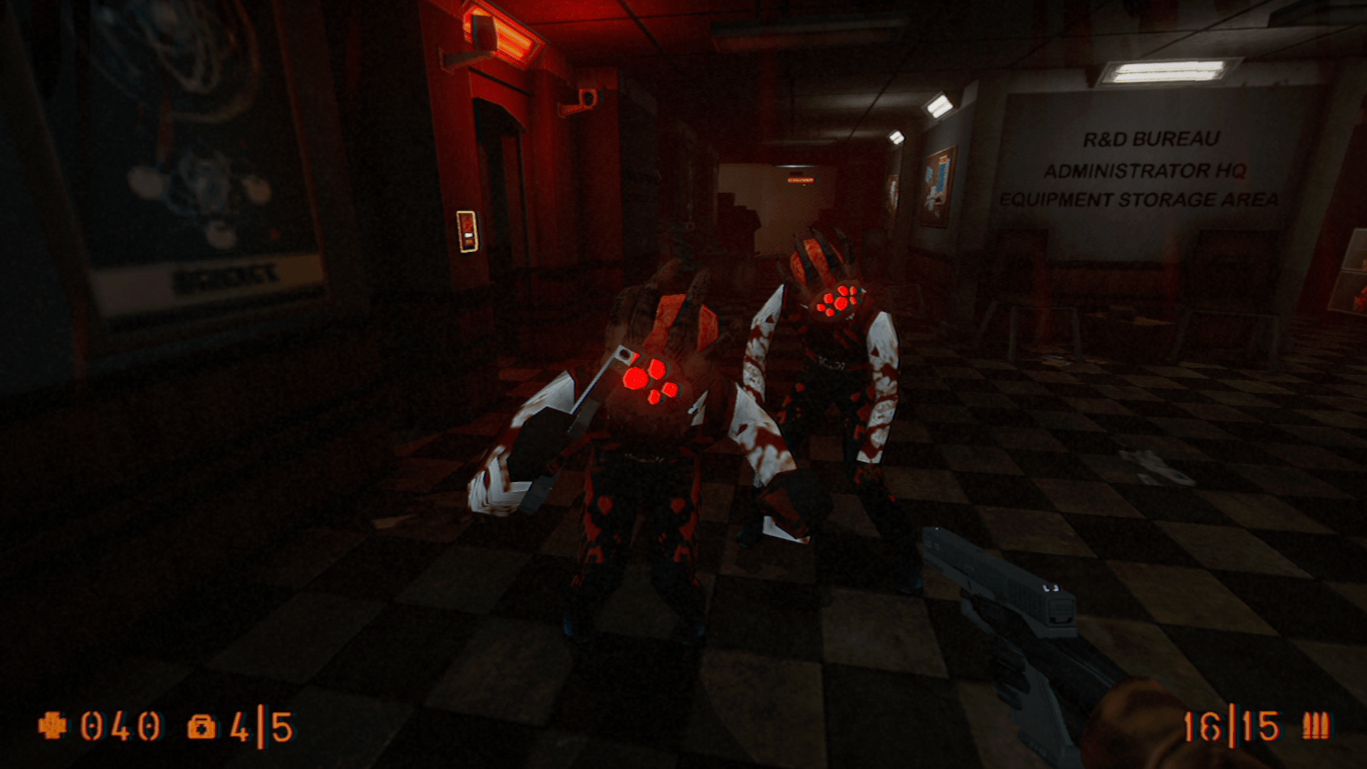 Le scénario s’inspire très librement du premier Half-Life. La corruption du personnel et les créatures qui sautent sur la tête pour s’emparer de l’esprit des victimes rappellent immédiatement les mécaniques du titre de Valve. Cet univers est soutenu par une excellente ambiance sonore et musicale qui renforce l’immersion dans cette catastrophe liée à l’énergie Re.Surs.