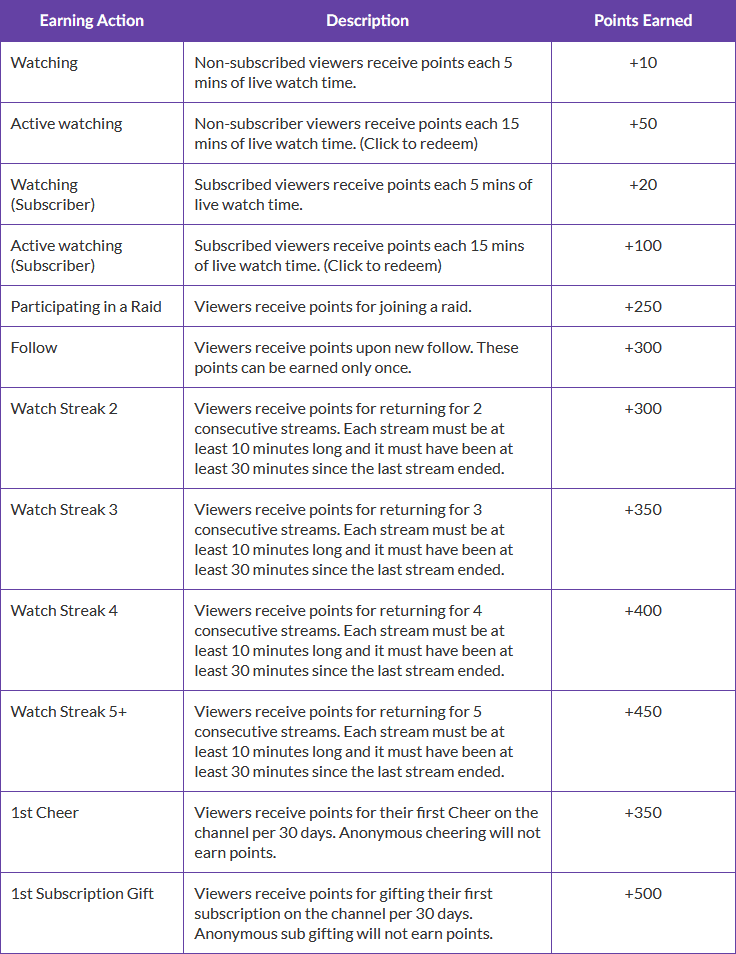 Le viewer gagne 10 points toutes les 5 minutes de live et 50 points toutes les 15 minutes en étant actif (en écrivant dans le chat).