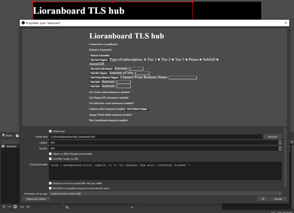 Là, vous allez cocher la case “Fichier local” et cherché dans le dossier où vous avez mis Lioranboard:C:/.../lioranboard/tsl_transmitter.html