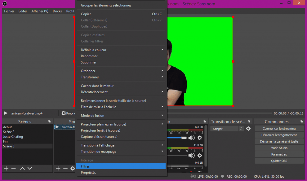 Dans votre source de votre webcam, vous allez faire un clique droit (gauche pour les gauchers) puis sélectionné “filtres”.