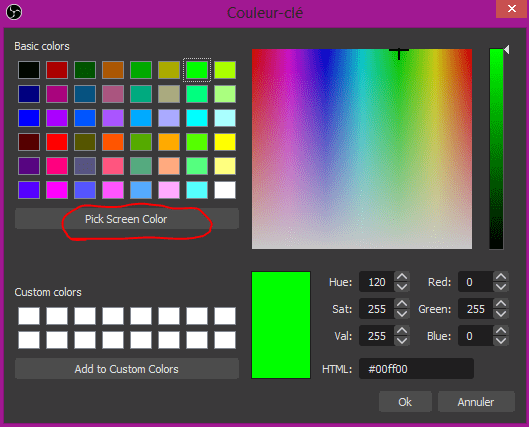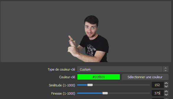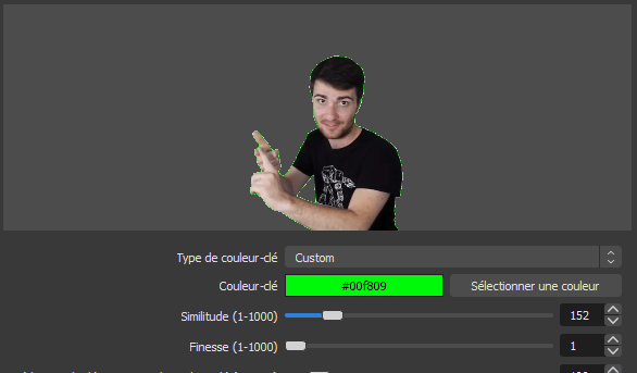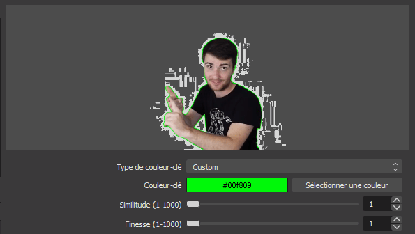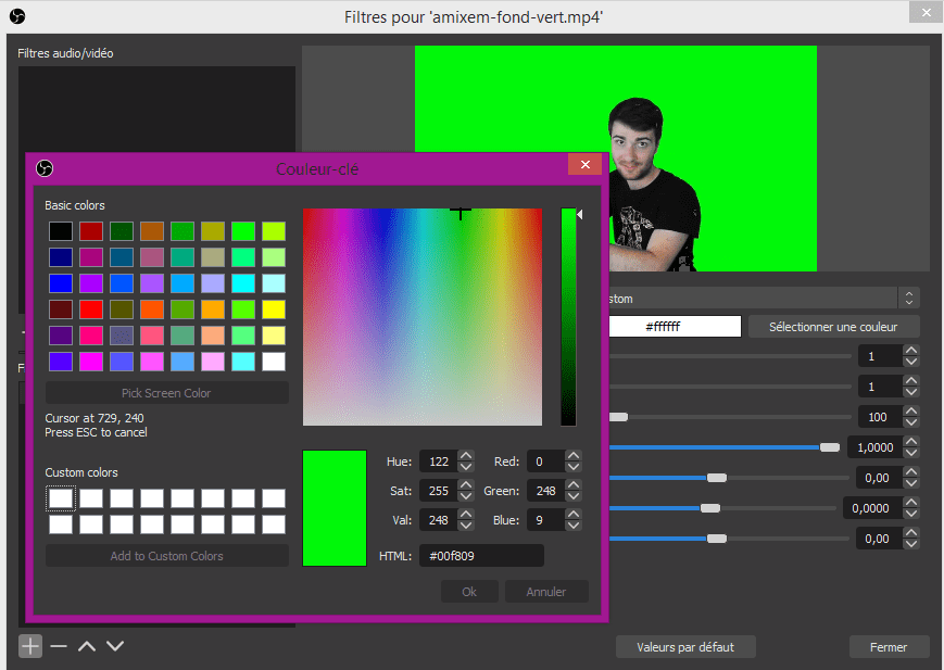 Choisissez custom, pourquoi parce que chaque toile fond vert à une teinte différente, mais aussi votre webcam ne va pas la voir de la couleur que vous la verrez !